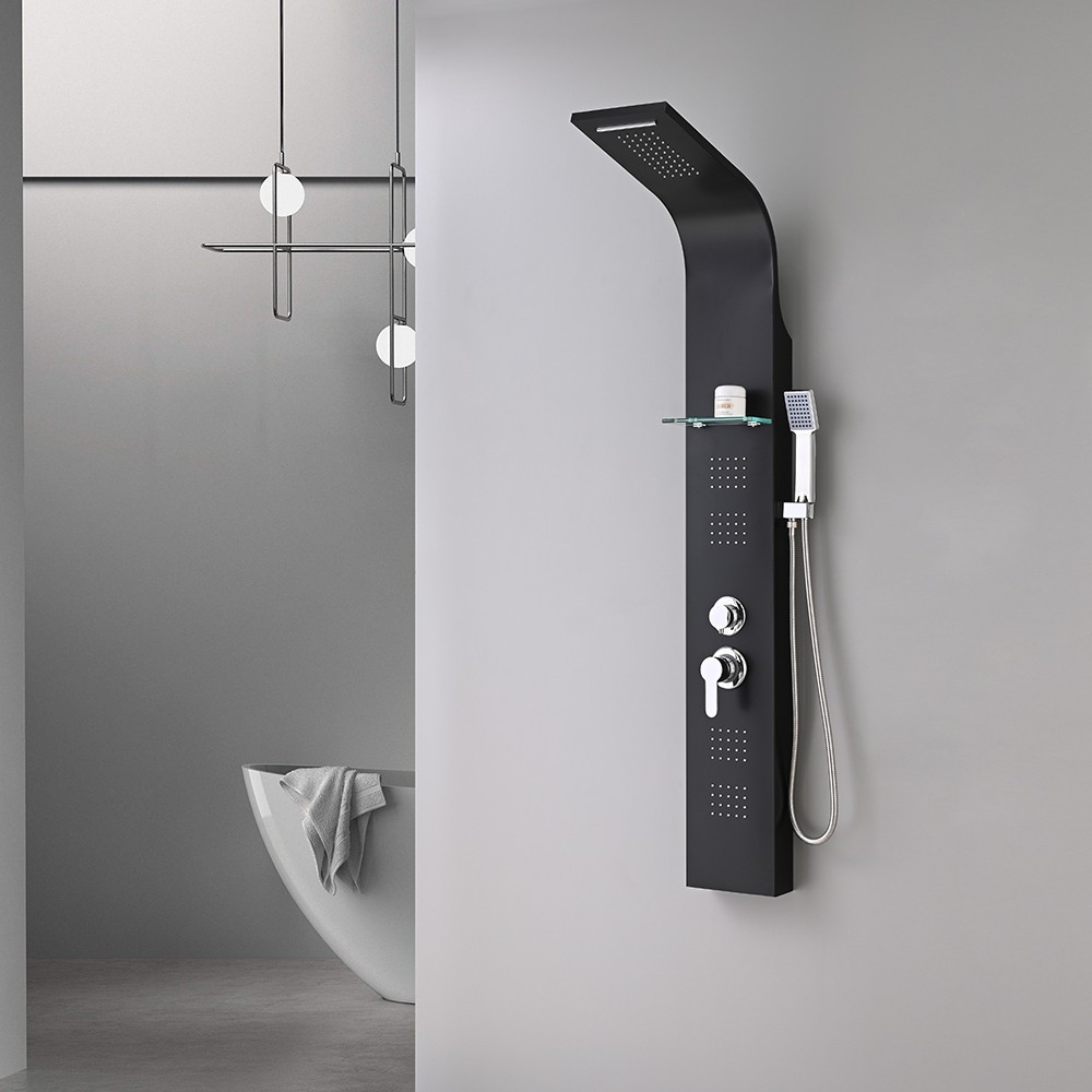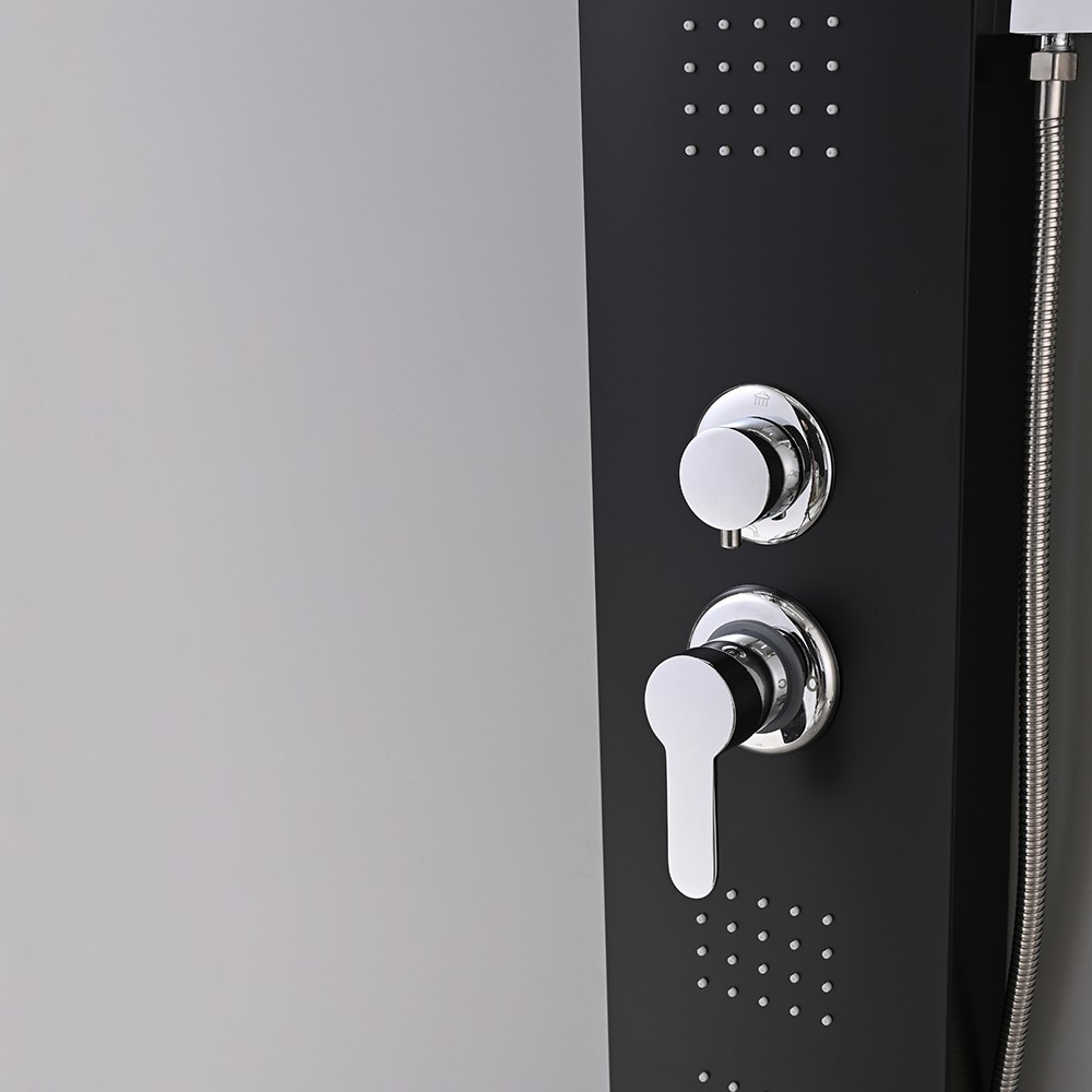 Panoul de duș cu hidromasaj Alegro Black este un sistem de duș exclusivist , din oțel inoxidabil , cu un design de înaltă calitate și multe caracteristici avansate. Acest panou de duș este alegerea perfectă dacă vă doriți o experiență de duș luxoasă și modernă. Panoul de duș este echipat cu un jet de ploaie mare și funcție de cascadă, care oferă o experiență de duș unică și impresionantă . Dușul tip ploaie emite picături fine de apă care permit un duș blând și relaxant, în timp ce funcția cascadă creează un jet de apă puternic și masiv, care oferă o relaxare plăcută.