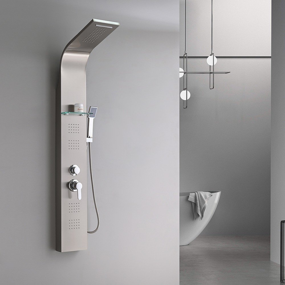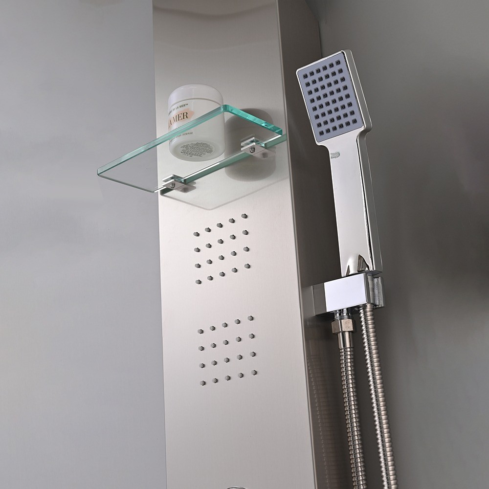 Panoul de duș este dotat cu un furtun din oțel inoxidabil lung de 150 cm, care vă permite să mutați capul de duș și să îl utilizați cu ușurință. În plus, pe panou există un raft practic din sticlă, unde puteți așeza cosmetice și alte articole de care aveți nevoie în timpul dușului. Panoul de duș cu hidromasaj Alegro Silver are o înălțime de 145 cm, o lățime de 20 cm și o adâncime de 7 cm, fiind o soluție compactă și care economisește spațiu pentru baia dumneavoastră. Alegerea materialului din oțel inoxidabil nu numai că garantează durabilitate și longevitate, dar îi conferă și un aspect elegant și modern.