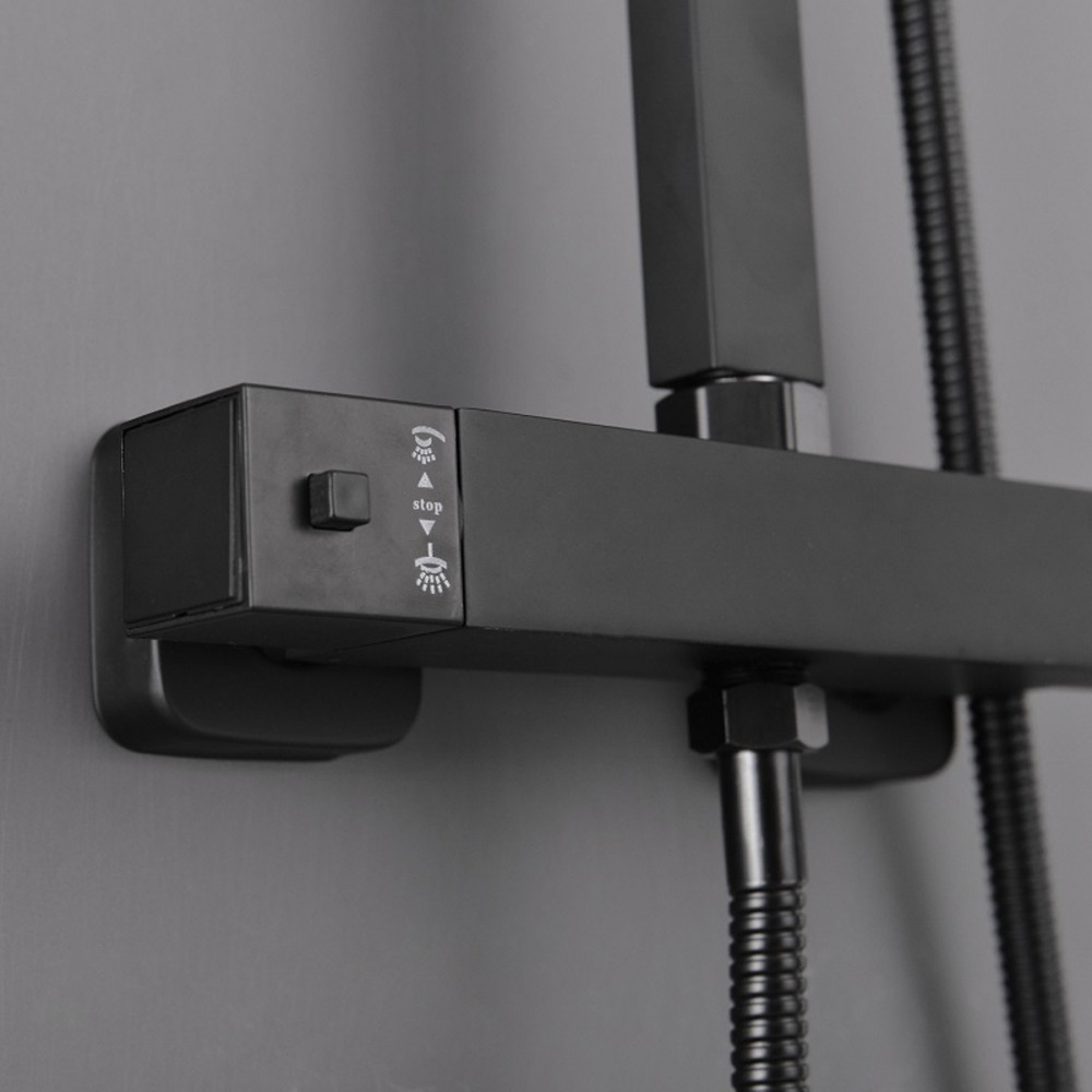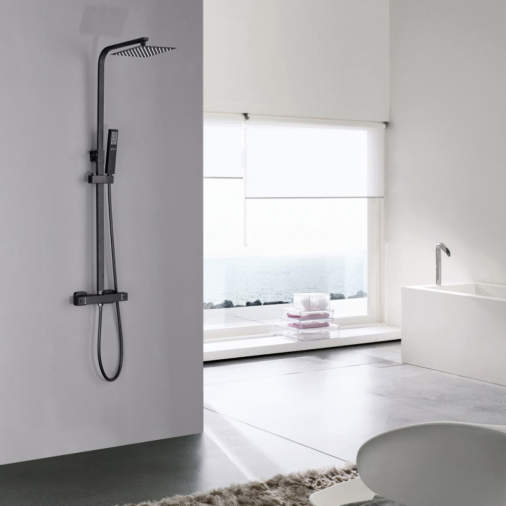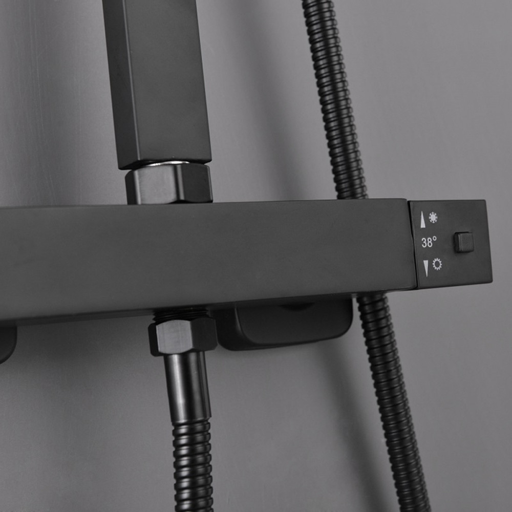 Setul de duș termostatic negru Mazama depășește orice imaginație datorită funcționalității și formei sale rafinate. Setul de duș Mazama este dotat cu o baterie mecanică de duș cu mixer de temperatură , reglare a temperaturii și un comutator de debit pentru a comuta între dușul cu efect de ploaie și capul de duș. Capul de duș manual, furtunul de duș de 1,5 m și capul de duș cu efect de ploaie sunt fabricate din ABS , vopsit în negru . Setul include un duș elegant cu efect de ploaie și un cap de duș . Corpul negru al setului de duș este fabricat din oțel inoxidabil, iar înălțimea sa este reglabilă ( 800-1200 mm ). Se recomandă instalarea setului de duș la 85 cm de sol. Dușul va fi o plăcere cu acest robinet. Pe lângă aspectul său, marele său avantaj este că este echipat și cu un duș manual și un duș cu efect de ploaie tropicală. Dușul cu efect de ploaie tropicală ușurează viața de zi cu zi și face experiența dușului și mai plăcută.