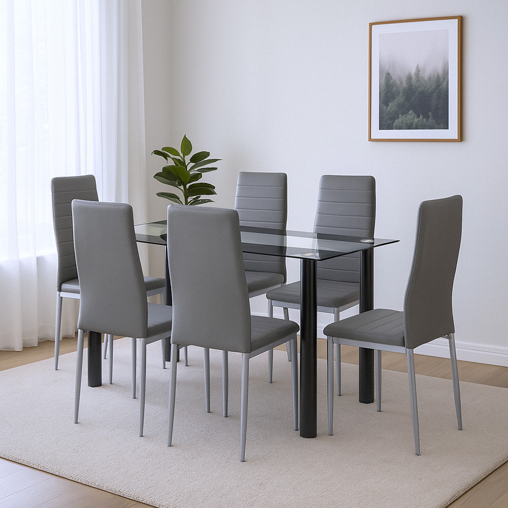 Culoarea gri se armonizează frumos cu schema de culori a mesei din sticlă gri fum, făcând întregul set coerent și echilibrat din punct de vedere vizual.