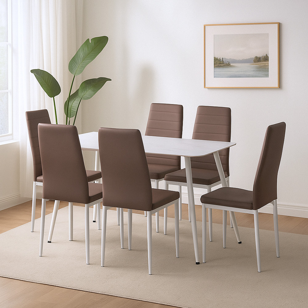 Setul de sufragerie Jenna este un exemplu perfect de cum să combini funcționalitatea cu simplitatea vizuală.Contrastul dintre blatul de masă din piatră sinterizată cu efect de ardezie deschisă și scaunele complet maro este deopotrivă elegant și caracteristic. Efectul general este îndrăzneț, dar sofisticat, ceea ce îl face o alegere ideală pentru spațiile moderne, minimaliste și rustice.
