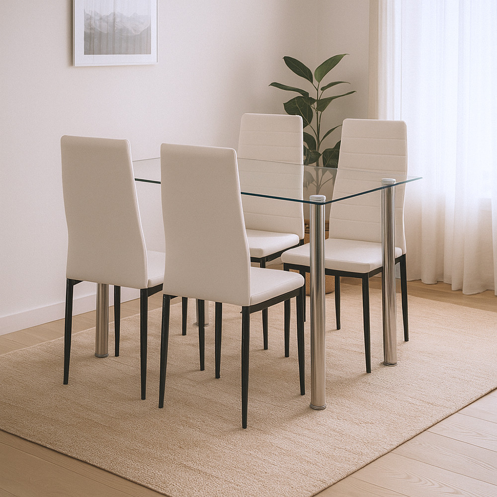 Piesa centrală a setului de sufragerie Mateo estemasa de sufragerie din sticlă Berna de 120 cm de la Leziter, una dintre cele mai populare piese din interioarele moderne.Topul din sticlă de 8mm grosime, tratat termic și temperat nu numai că oferă un aspect elegant, dar este și foarte rezistent la zgârieturi și impacturi. Suprafața de sticlă este ușor de curățat, astfel încât își păstrează aspectul strălucitor și curat chiar și în timpul utilizării zilnice.
