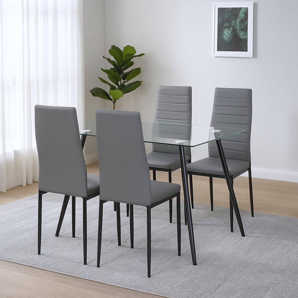 Setul de sufragerie Nash 4+1 combină designul curat cu funcționalitatea. Masa din sticlă Lana și scaunele Tino NOVA combină minimalismul, stabilitatea și confortul în armonie perfectă. Combinația modernă de culori gri și negru adaugă caracter vizual spațiului, în timp ce tonurile neutre îl fac ușor de integrat într-o varietate de interioare - fie scandinave, moderne sau industriale.