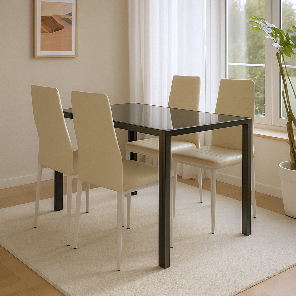 Setul de sufragerie Nicole 4+1 este o alegere excelentă pentru cei cărora le plac tonurile puternice, închise, dar care nu doresc să facă compromisuri în ceea ce privește confortul și funcționalitatea.Masa de sticlă gri fumși scaunele de sufragerie bej creează o unitate armonioasă care se potrivește perfect în interioarele moderne, minimaliste sau în stil industrial.