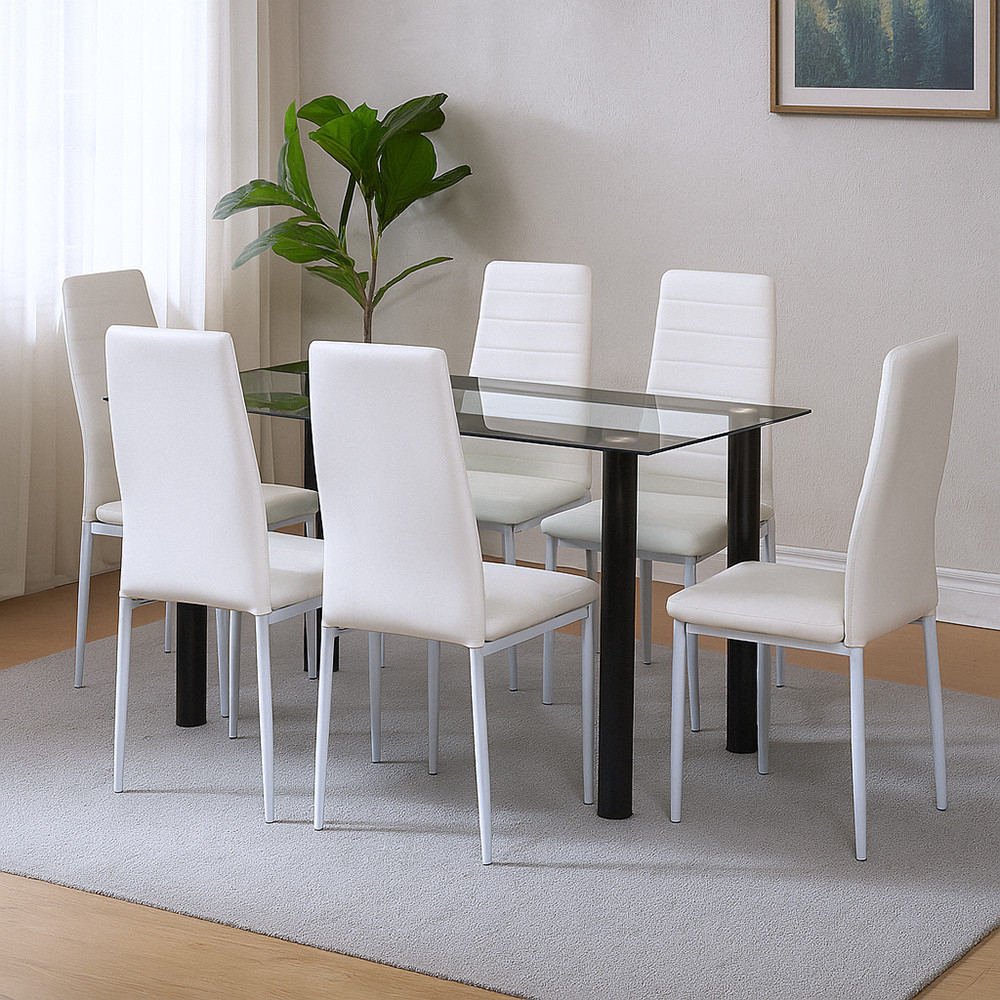 Blatul mesei din sticlă călită are o grosime de 8 mm, fiind rezistent la zgârieturi și căldură, în timp ce poate fi curățat cu o singură mișcare ușoară. Dimensiunile sale - 140 x 80 x 75 cm - permit ca 4-6 persoane să stea confortabil în jurul său.