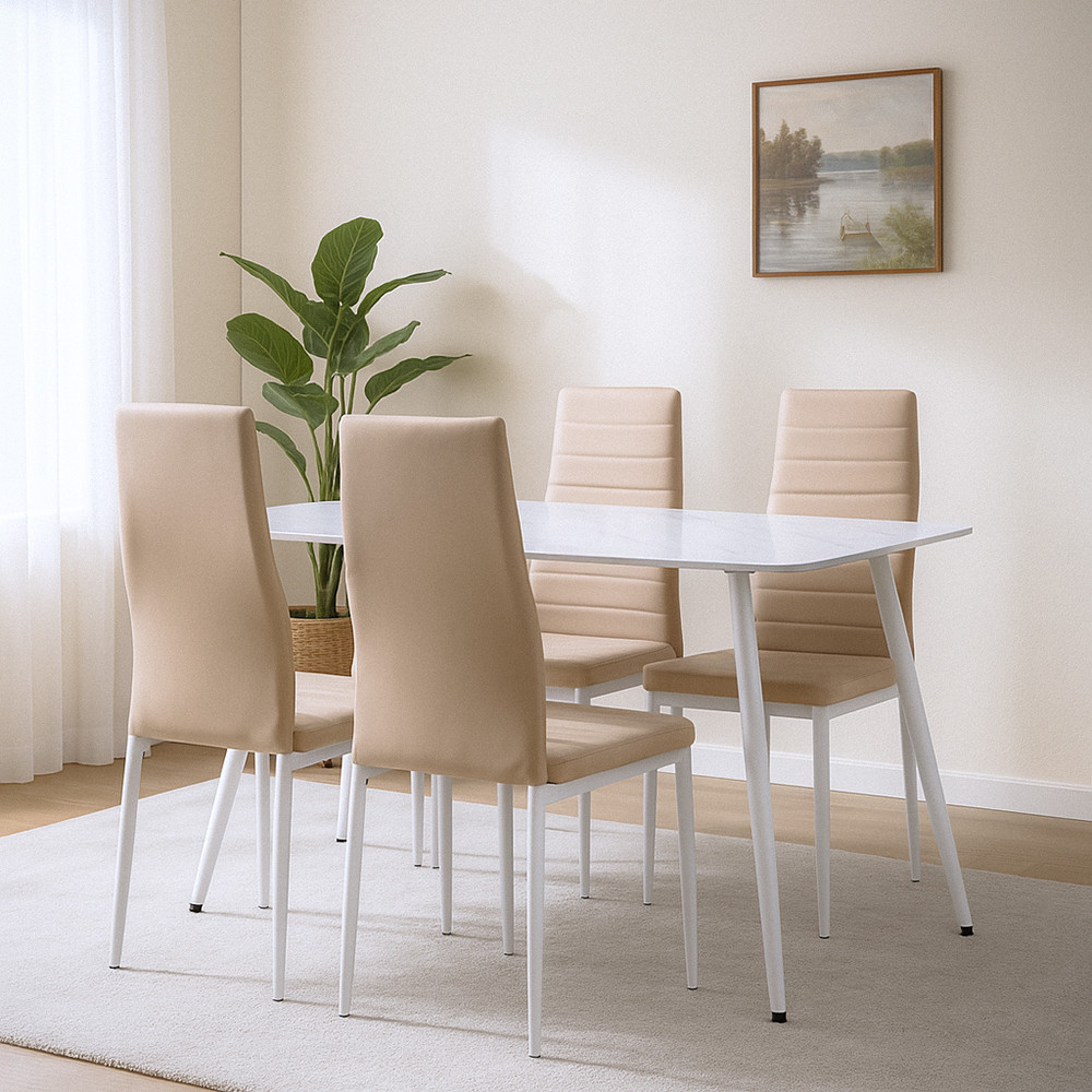 Scaunelede dining TinoNOVAdin setul Renton cu aspectul lor sofisticat și designul robust fac pereche perfectă cu masa Bora.Scaunele din piele textilă bej sunt moi, dar durabile, în timp ce picioarele din metal acoperit cu pulbere gri emană eleganță, garantând în același timp un suport fiabil.