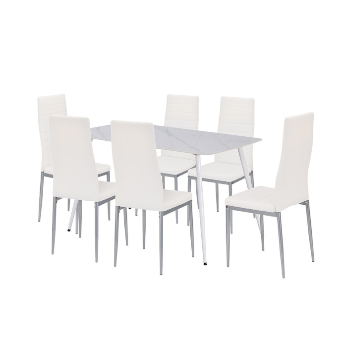 Combinația contrastantăde culori alb și gri încadrează elegant starea de spirit a spațiului, în timp ce suprafețele sale ușor de curățat și rezistente la uzură o fac o alegere cu adevărat practică atât pentru zilele ocupate din timpul săptămânii, cât și pentru ocaziile speciale. Setul este o alegere impecabilă pentru familiile mici sau cuplurile care apreciază materialele atemporale și designul modern.