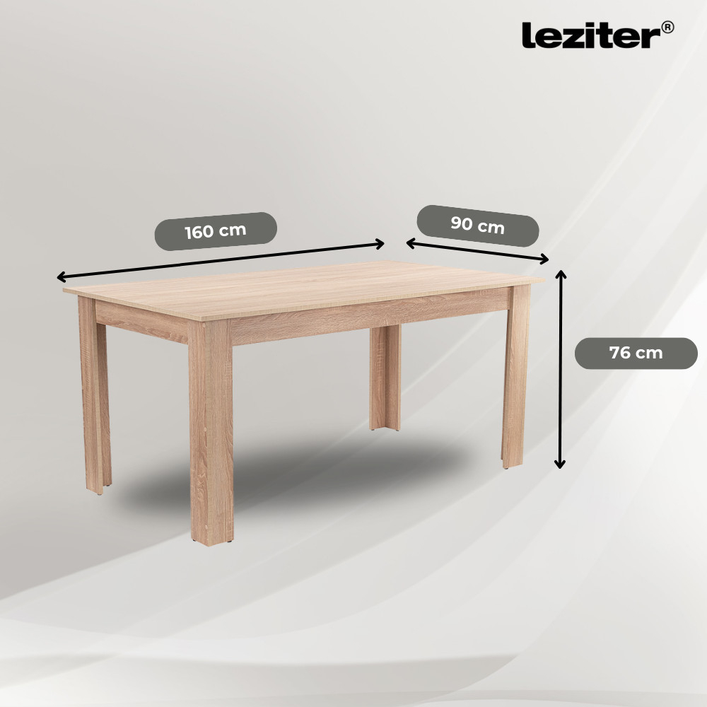 Setul de masă cu 4 locuri Leziter Leon are tot ce vă așteptați de la o piesă de mobilier modernă și fiabilă. Masa este fabricată din lemn masiv de stejar Sonoma, rezistent, și măsoară 160x90x76 cm, astfel încât poate funcționa ca o piesă de mobilier mai proeminentă în sufragerii de dimensiuni medii, în timp ce poate servi ca o masă centrală elegantă și confortabilă în spații mai mari. Oferă spațiu ideal pentru 6-8 persoane, fiind o alegere excelentă pentru cine în familie sau întâlniri cu prietenii. Designul montat pe panou permite o asamblare rapidă și ușoară, în timp ce întăriturile metalice ale colțurilor garantează stabilitatea și longevitatea.