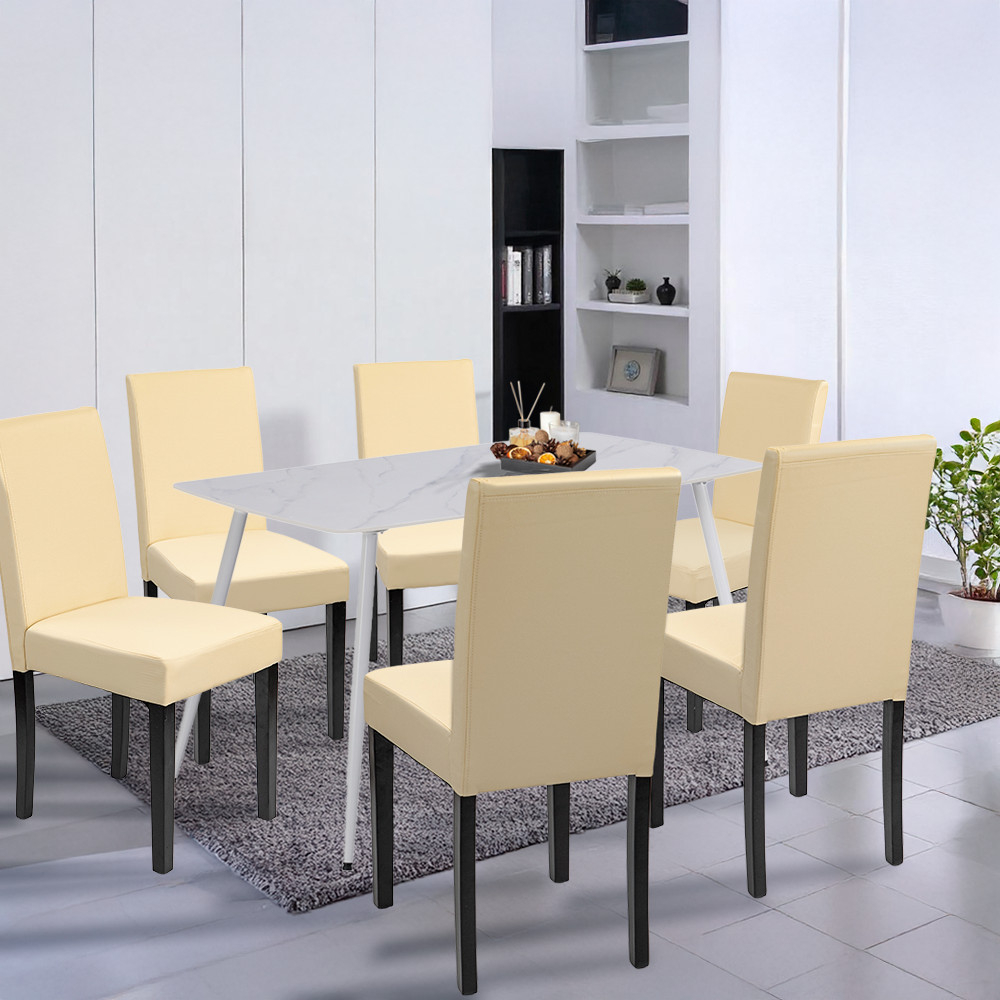 Setul include șase scaune Leziter Kelly, care, datorită tapițeriei din piele ECO bej, sunt nu doar elegante, ci și extrem de ușor de curățat. Șezutul gros din spumă, de 4 cm, oferă confort chiar și în timpul unei cine mai lungi, iar picioarele stabile din lemn de pin, cu o capacitate de încărcare de 120 kg, rămân tovarăși de încredere chiar și în timpul utilizării intense.