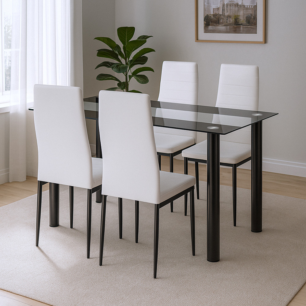 Combinația de culori alb și negru se armonizează perfect cu schema de culori a mesei din sticlă gri fum, făcând întregul set coerent și echilibrat din punct de vedere vizual.