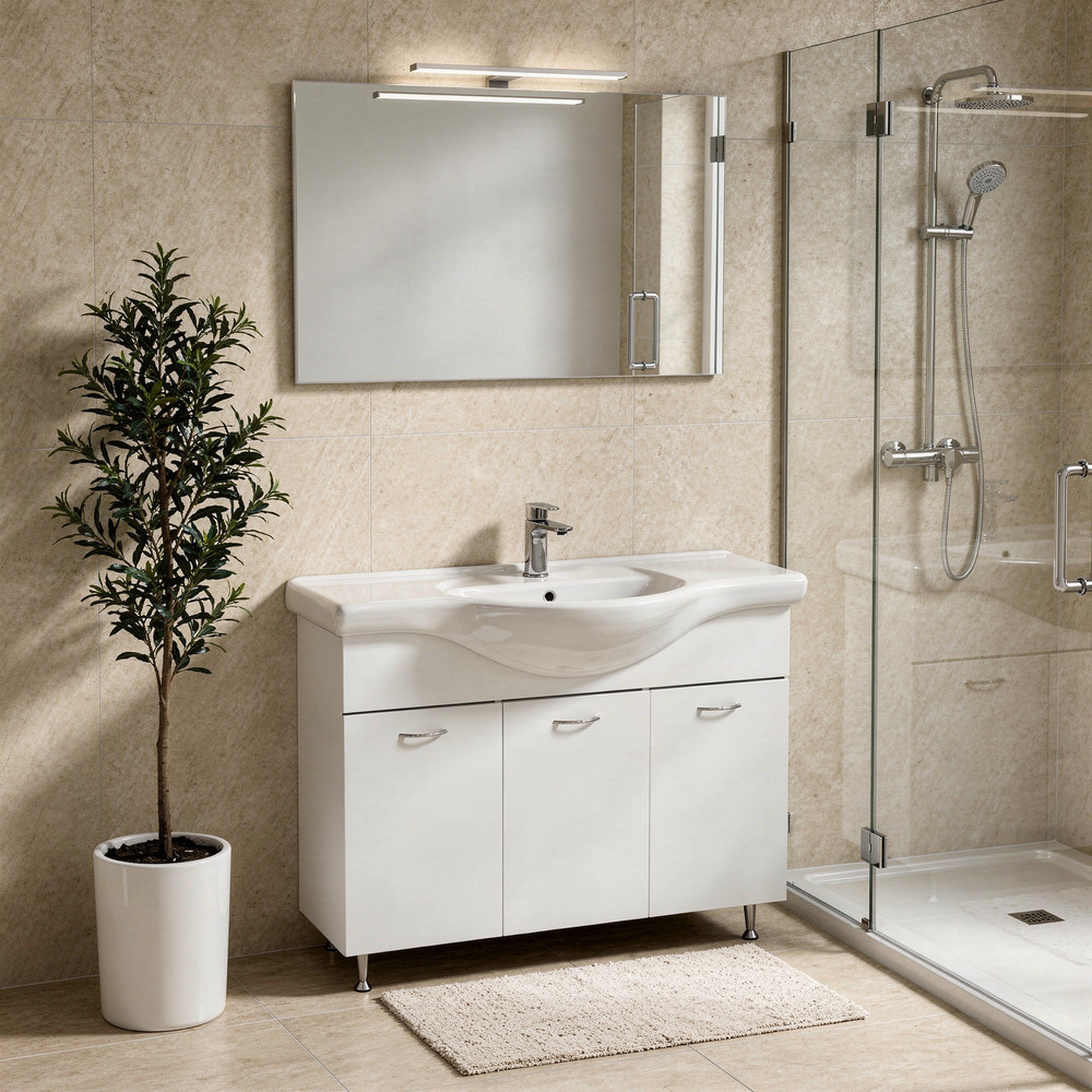 Corpul alb al panoului de mobilier este asociat cu mânerele cromate, în timp ce designul curbat al chiuvetei ceramice adaugă eleganță. Oglinda minimalistă CUBE (105 × 80 cm) vine neînrămată și neiluminată - poate fi combinată liber cu orice lampă de perete.