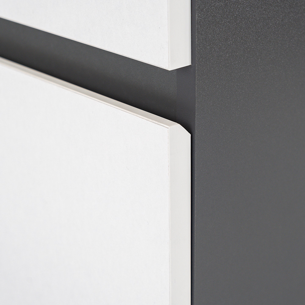 Mobilierul complet de baie Vario Forte 60 este o alegere elegantă și practică pentru o baie modernă. Dimensiunile sale compacte sunt ideale pentru băi mici și medii, închiderea la margine la 45 de grade conferă spațiului un efect modern, iar designul alb-antracit îi conferă un aspect elegant. Sertarul cu închidere silențioasă și designul suspendat oferă confort și curățare ușoară, în timp ce materialele de calitate asigură o durată lungă de viață.