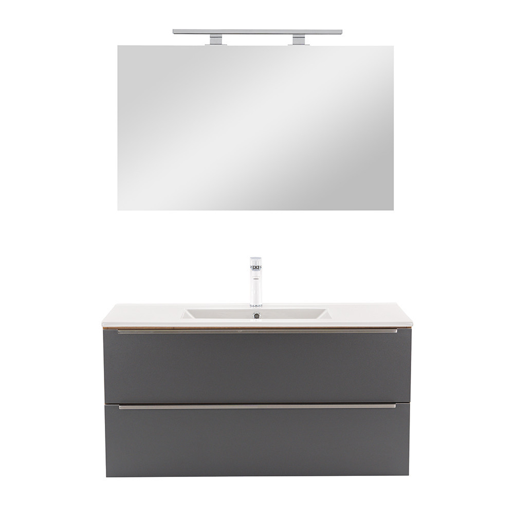 Mobilierul complet de baie Vario Trim 100 este o alegere elegantă și practică pentru o baie modernă. Dimensiunile sale compacte sunt ideale pentru băi mici și medii, iar designul din stejar-antracit conferă spațiului un aspect elegant. Sertarul cu închidere silențioasă și designul suspendat oferă confort și curățare ușoară, în timp ce materialele de calitate asigură o durată lungă de viață.