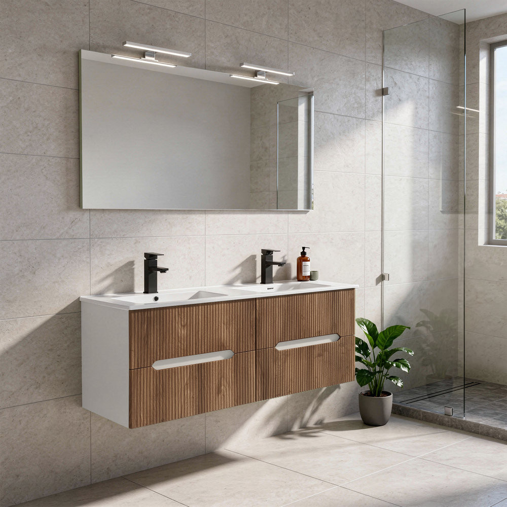 Mobilierul de baie Leziter Trent combină armonios estetica și caracterul practic. Panoul frontal canelat îi conferă un caracter curat și modern, în timp ce mânerul integrat permite o utilizare convenabilă. Fixarea pe perete creează un aspect fără efort și face curățarea podelei mai rapidă. Chiuveta din ceramică este durabilă, atemporală, rezistentă la uzura zilnică și ușor de păstrat curată.