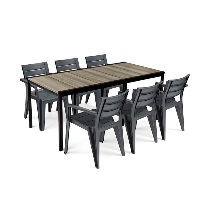 Blatul de masă în tonuri calde de cenușă este perfect echilibrat cu liniile curate ale scaunelor din grafit. Rezultatul? Un grup de mobilier elegant, dar practic, care se integrează armonios într-un mediu modern, scandinav sau mediteranean. Acest set nu este doar practic, ci și plăcut din punct de vedere estetic.