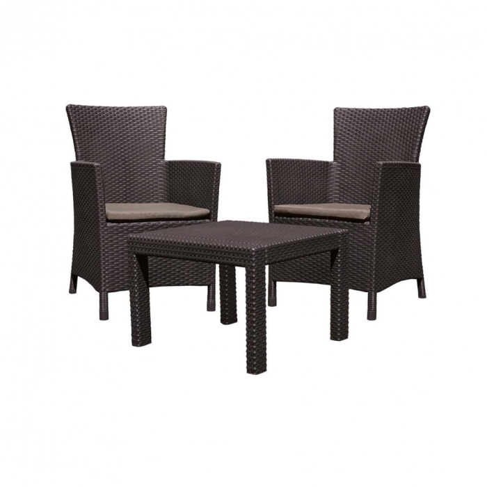 Balconul Rosario este un set elegant de mobilier de grădină. Setul prezentat este într-o frumoasă culoare maro. Producătorul de mobilă este Allibert, care folosește plastic de înaltă calitate pentru a produce echipamente de exterior. Setul de balcon Rosario este format dintr-o măsuță de cafea și două scaune cu cotiere și perne de șezut.