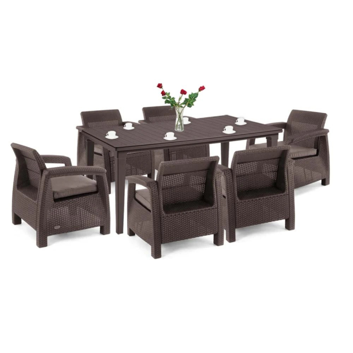 Setul de mobilier de grădină Corfu Big Duo este un element ideal pentru decorarea grădinii, balconului sau terasei dumneavoastră. Forma sa simplă îl face universal și se adaptează oricărei configurații. Setul de mobilier de grădină dă impresia că este fabricat din lemn, dar de fapt este fabricat din plastic de înaltă calitate.