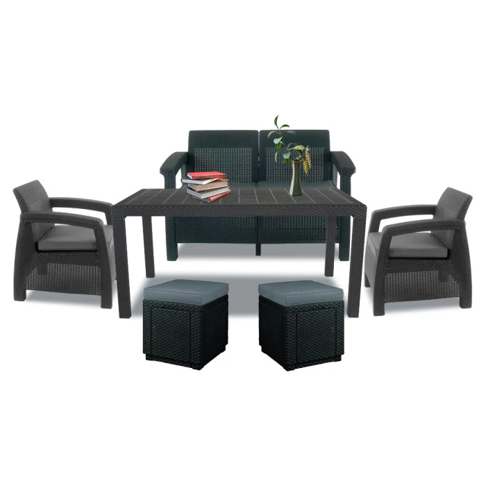 Elegantul set de mobilier de relaxare Fiesta duo cube garantează confort maxim utilizatorilor săi. Setul prezintă un design modern inspirat de țesutul natural din ratan. Stabilitatea și confortul setului se datorează construcției sale solide și structurii bine gândite. Setul de mobilier include o canapea cu două locuri, două fotolii simple, două pufuri și o masă. Linia de produse Fiesta - disponibilă cu perne confortabile. Mobila este rezistentă la intemperii și la radiațiile UV. Mobila este fabricată de Curver , ale cărei produse pot fi găsite și sub marca Keter . Fiesta este un produs european de înaltă calitate, fabricat din plastic turnat prin injecție de cea mai înaltă calitate.