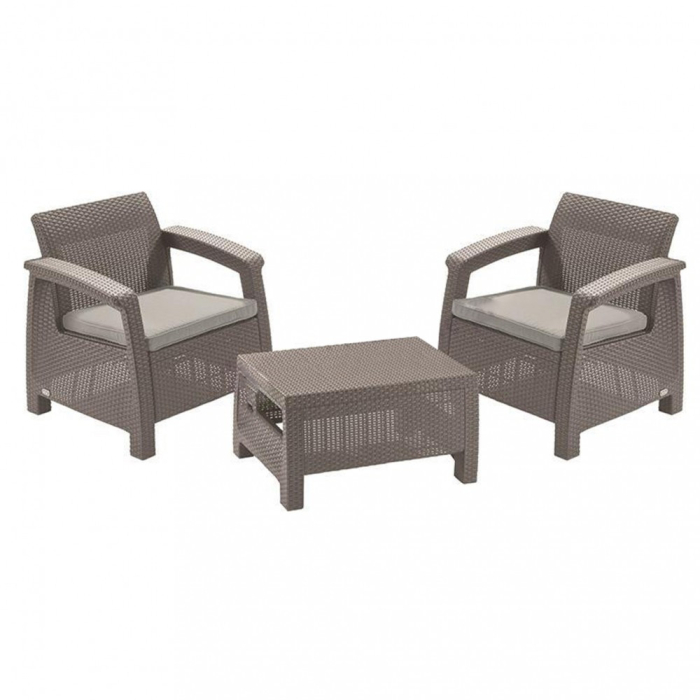 Mobilierul de grădină Corfu Weekend combină rezistența materialului, perfecțiunea manoperei și confortul ridicat în utilizare. Masa și scaunele sunt în culoarea cappuccino, în timp ce pernele șezuturilor sunt de culoarea nisipului. Această combinație este asociată cu materiale naturale - aceste culori sunt incluse în culorile pământului. Datorită acestui fapt, se îmbină bine cu vegetația și cu interioarele. În 2016, a fost introdusă schimbarea culorii. Culoarea cappuccino a înlocuit culoarea nisip disponibilă anterior. Culoarea este mai apropiată de bej/maro deschis, mai elegantă decât precedenta. Structura mobilierului imită ratanul plat - la prima vedere poate părea ratan adevărat. Pernele tapițate adaugă mai multă eleganță întregului, iar picioarele estetice joase oferă o stabilitate adecvată. Fotoliile sunt extrem de confortabile datorită pernelor plate și moi, spătarelor profilate și cotierelor late. Petrecem multe momente frumoase și liniștite cu setul Corfu Weekend.