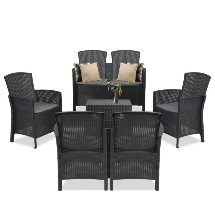 Setul de mobilier de grădină din ratan de culoarea grafit este format din două fotolii de 56 x 90 x 60 cm, două canapele de 59 x 90 x 112 cm și o masă dreptunghiulară de 60 x 54 x 41 cm. Acesta este un produs de înaltă calitate, fabricat din plastic turnat prin injecție de cea mai înaltă calitate.