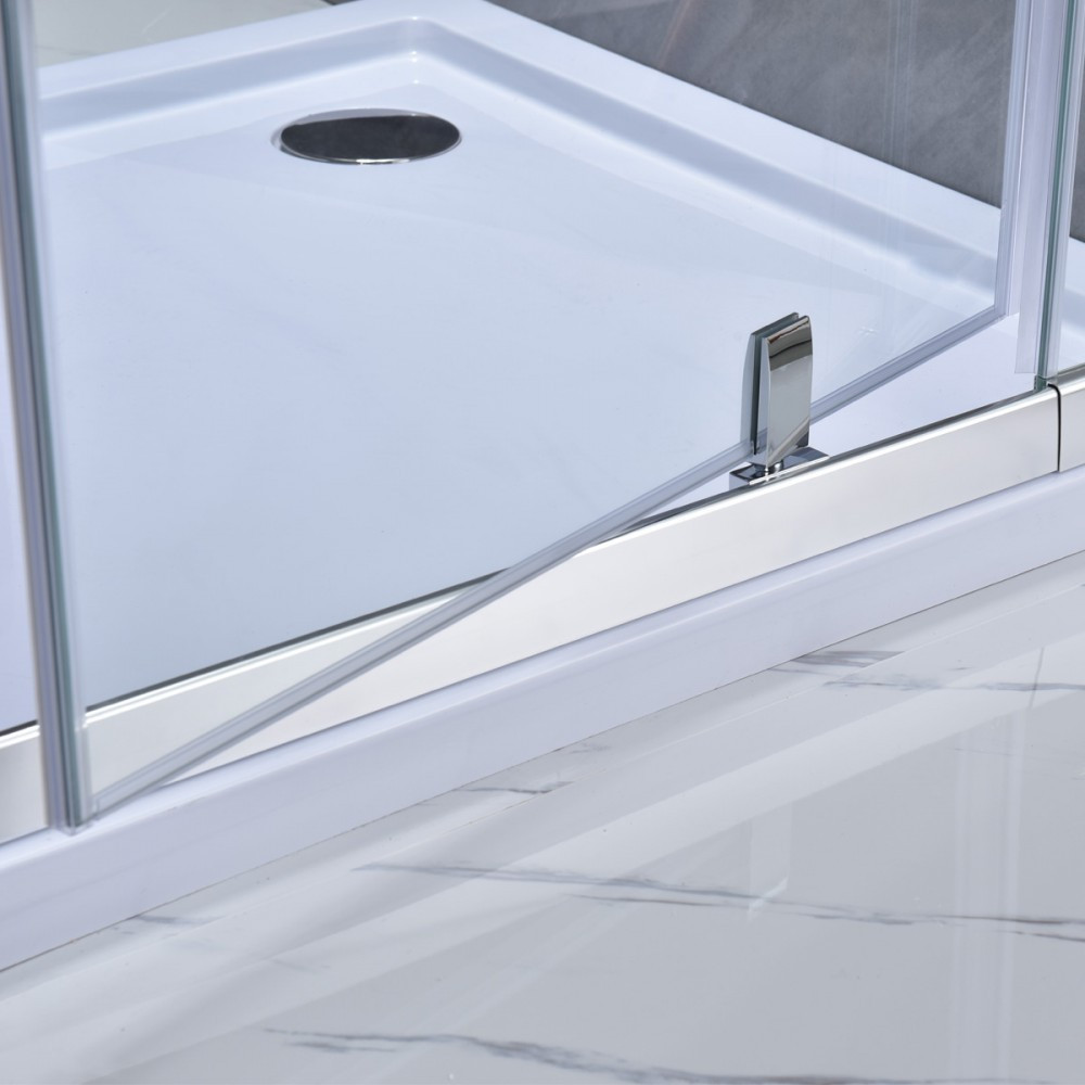 Ușa de duș este echipată cu o ramă din aluminiu cromat și sticlă securizată transparentă de 6 mm. Modelul are o lățime de 76-91 cm și o înălțime de 185 cm.