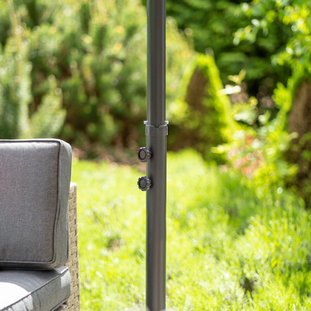 Umbrela de grădină este poziționată pe partea laterală a structurii, permițând utilizarea 100% a zonei de umbră. Cu umbrela bej puteți crea un loc umbrit pentru relaxare, împărțirea meselor sau întâlnirea cu cei dragi. Protecția UV 50+ utilizată în husă oferă protecție suplimentară împotriva razelor solare.