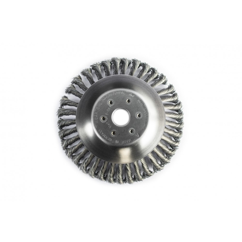 Disc cu perie fabricat din oțel de înaltă calitate, care poate rezista la sarcini centrifuge și viteze foarte mari de până la 10.000/min. Poate fi folosit direct pentru unelte precum mașini de tuns iarba sau mașini de tuns iarba, atât cu combustie, cât și electrice.