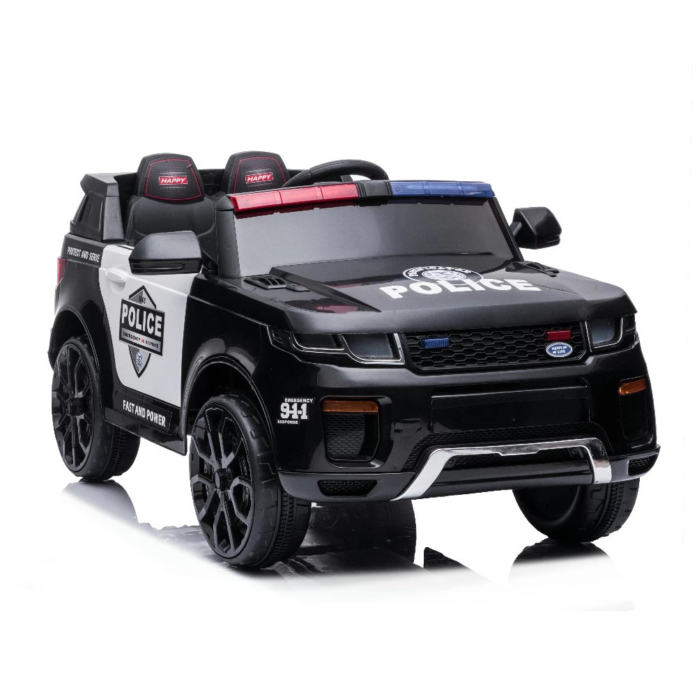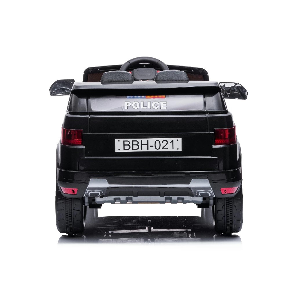 Bateria reîncărcabilă puternică de 12V, telecomanda radio pentru părinți și încărcătorul sunt accesorii ale produsului. Mașina de poliție are faruri, conector MP3, oglinzi retrovizoare și volan activat prin sunet.